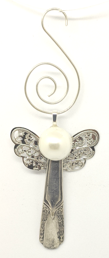 Vintage silverware handles, faux pearl, hand created sterling silver hook, laser-cut wings, and a silver bail which allows this item to be placed on a necklace instead of using as an ornament. Each ornament includes an organza jewelry bag. The angel from bail to end measure 2 7/8″ with a 2″ hanging hook. This item could also hang in a window. The pattern is from Wm Rogers & Sons and called Talisman from 1938.