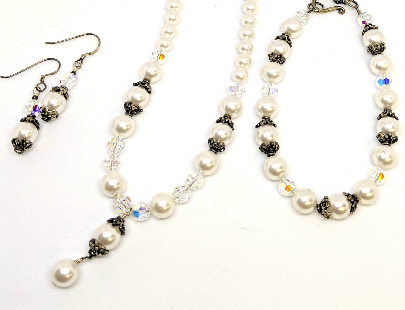 This is a beautiful sterling silver piece with Swarovski crystals and pearls. Measures 10″ with U shaped closure. The bracelet is a nice complimentary piece to the necklace Measures 8″ with U shaped closure. To complete the ensemble a delicate pair of earrings Measures 1 1/2″ with fish hook and rubber stopper. All Jeweled Up design.